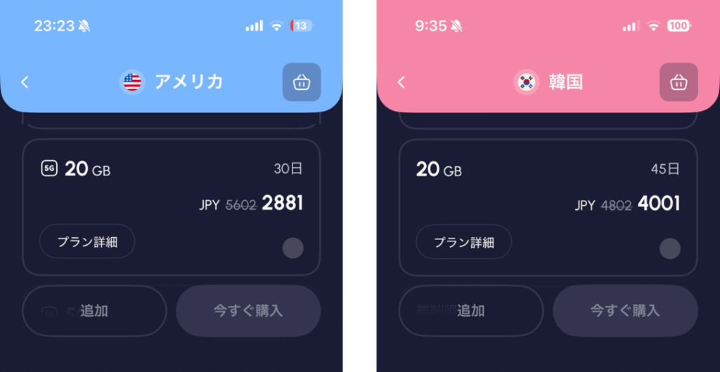 たとえば、アメリカの20GBプランがほぼ50%OFF、韓国も20%OFFで購入できちゃうんですね。 「本当にそんなに安くなるの?」と思うくらい、かなりお得な価格設定になっていますね。