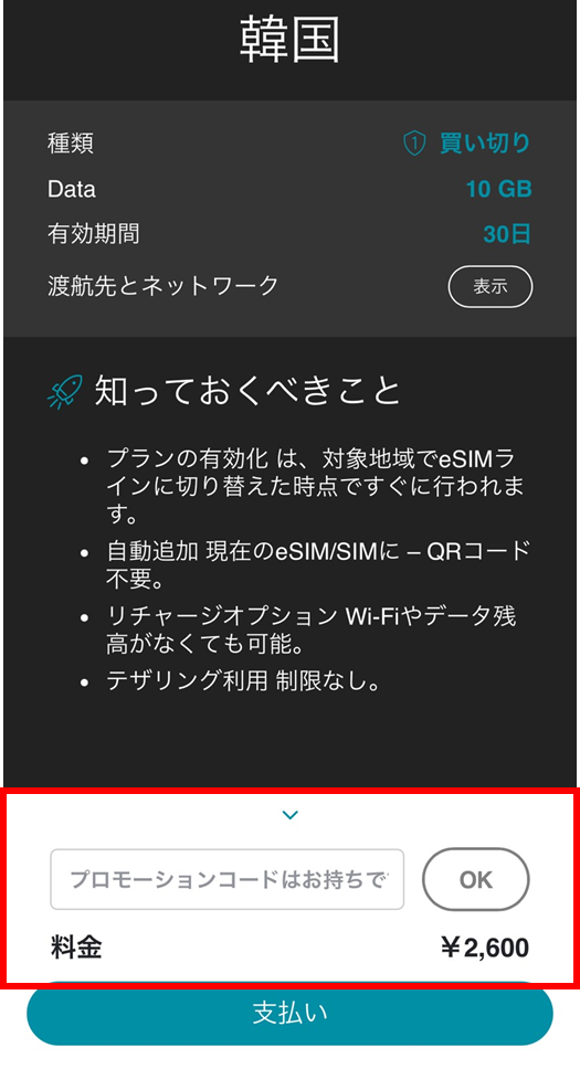 海外eSIMの教科書限定のプロモーションコードを購入前に入力するだけで、全プランが10%OFFで買えちゃうんですね。