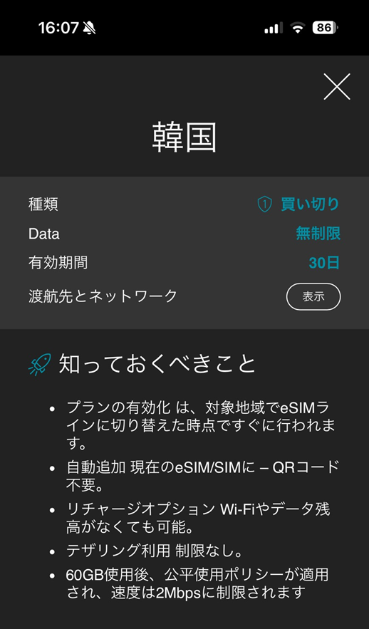 プランの有効期限は現地で初めてネットワークを検知した時点からスタートするので、早めに購入しても損はありません。