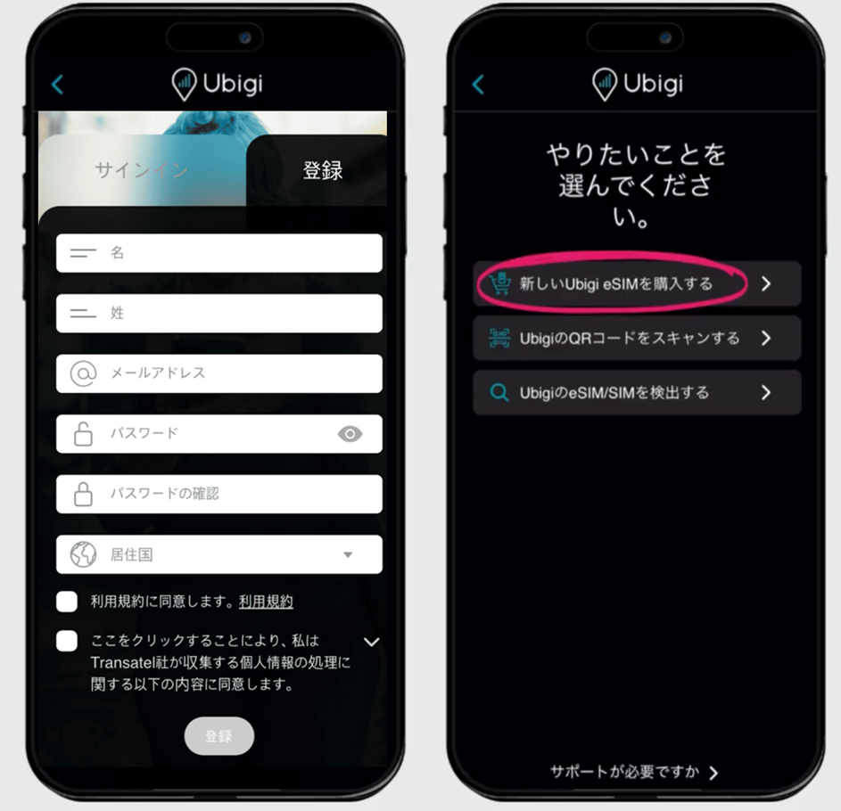 UbigiのeSIMは、公式アプリからでも、アプリをダウンロードせずにWEBサイトからでも購入・インストールが可能です。