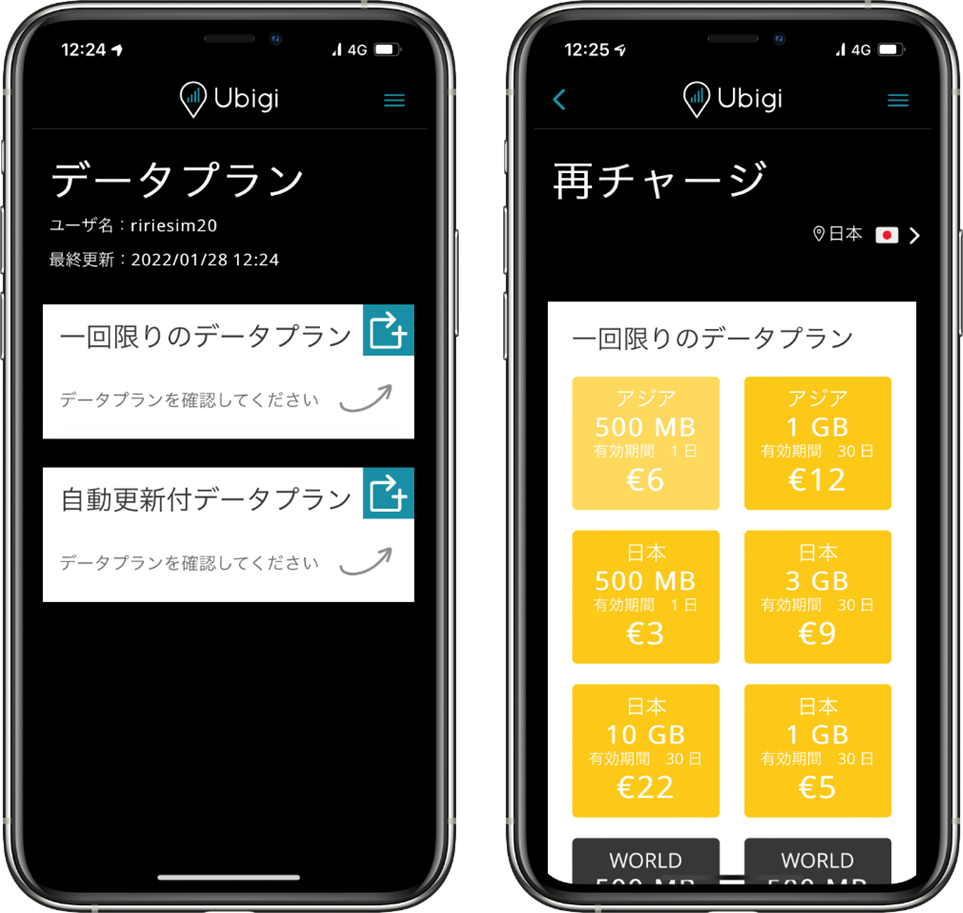 Ubigiアプリを開き、現在のeSIMプランを選択し「チャージ」または「新しいプランを追加」をタップするだけ。