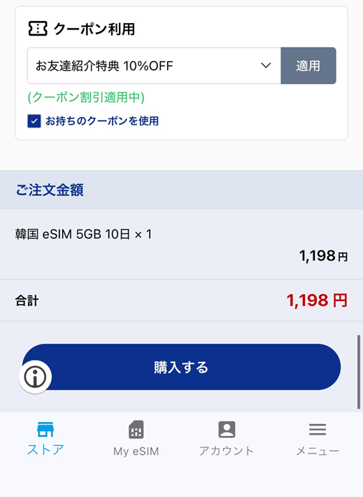 ・海外eSIMの教科書のクーポン(R_LLEPMI)を入力
